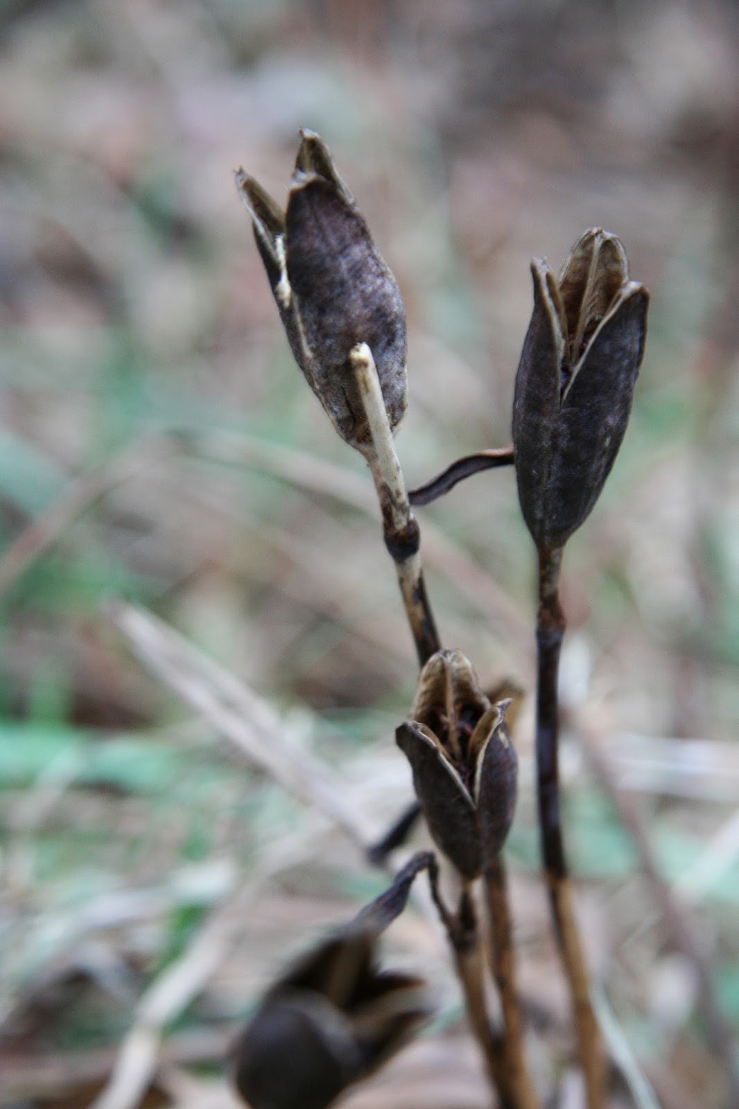 As mentioned in my previous post, I love to see the pods, dried flowers and cones in the garden. This is a dried passion flower pod. Should have clipped this off and placed the seeds where I wanted them. Instead I left it on there and seeds scattered everywhere. Now I have passion flower vines popping up all over the flower garden!